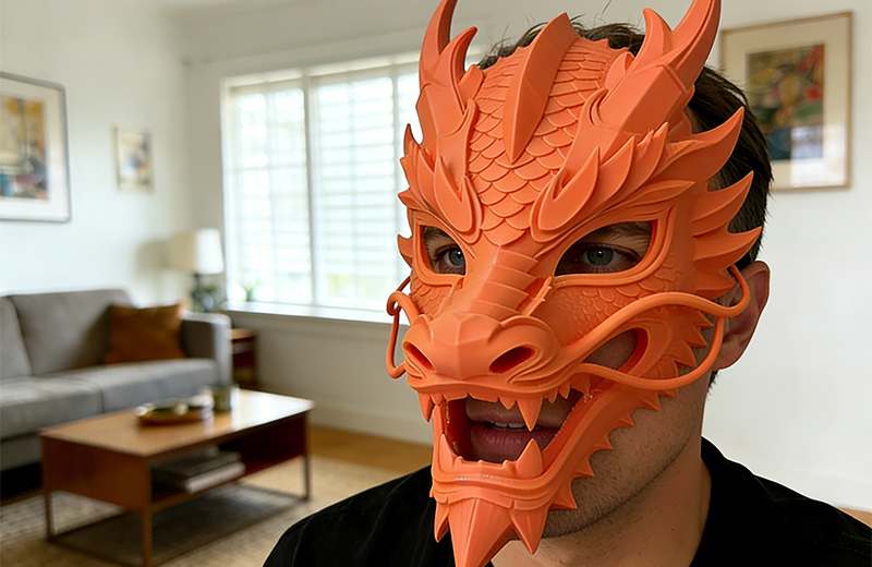 后处理完成后,可进行喷漆上色,用底漆、面漆还原橙红或金色龙纹,用黑色勾勒龙须、龙角边缘增强立体感。佩戴测试时,检查视野是否清晰、呼吸是否顺畅、挂耳或绑带是否牢固,若贴合度不佳,可通过打磨边缘或加热微调(仅限 PETG 材料)优化佩戴体验。