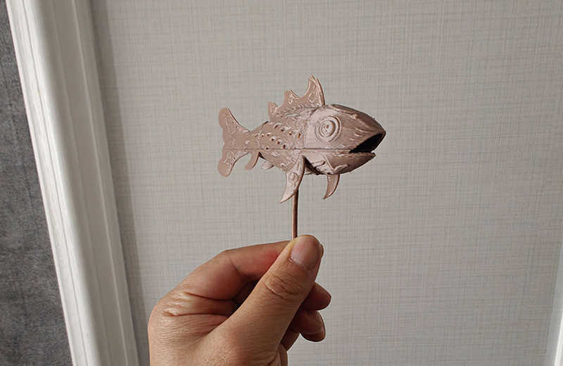 接下来是切片与打印实施阶段,选用FDM打印机或光固化打印机,FDM适合快速打样,光固化更适合还原精细纹理;FDM打印时优先选用透光PLA或TPU材料,切片参数设为层高0.15–0.2mm,填充密度10–15%以提升透光效果,仅在背鳍、尾鳍等悬空部位添加少量树状支撑;光固化打印时选用半透明光敏树脂,层厚设为0.05–0.1mm,支撑仅布置在边缘部位,打印后用酒精清洗并紫外固化;打印前预热FDM喷嘴至200℃、热床至60℃,光固化机校准平台与曝光时间,打印完成后小心去除支撑,清理鱼身镂空部位残留。